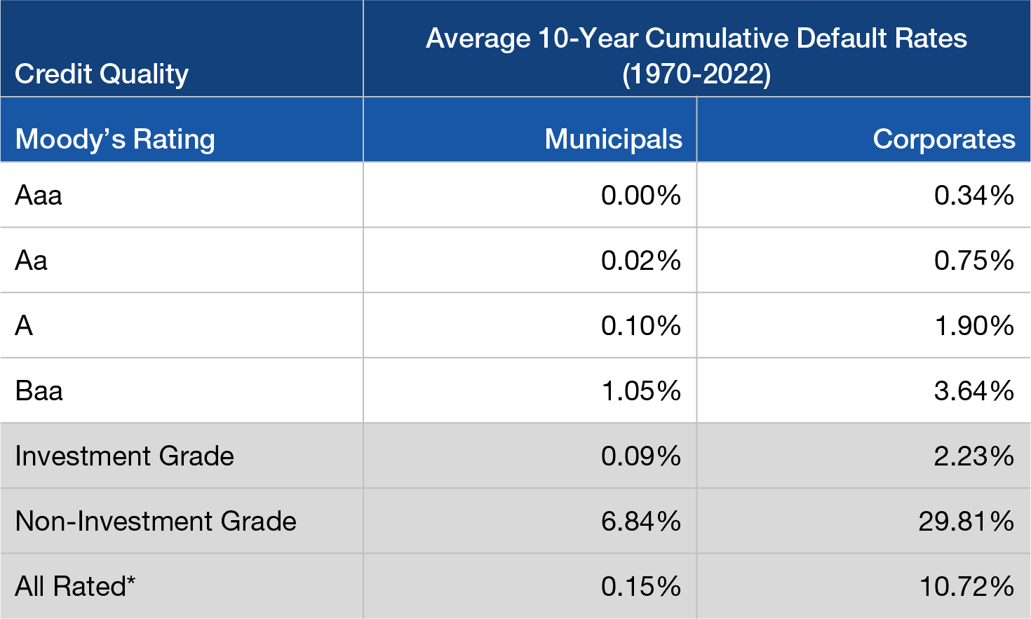 Source: Moody’s, “Moody’s U.S. Municipal Bond Defaults and Recoveries, 1970–2022,” July 2023 (latest available historical data). Data show the average 10-year cumulative default rates of Moody’s rated corporate and municipal bonds for a study covering the period 1970-2022.