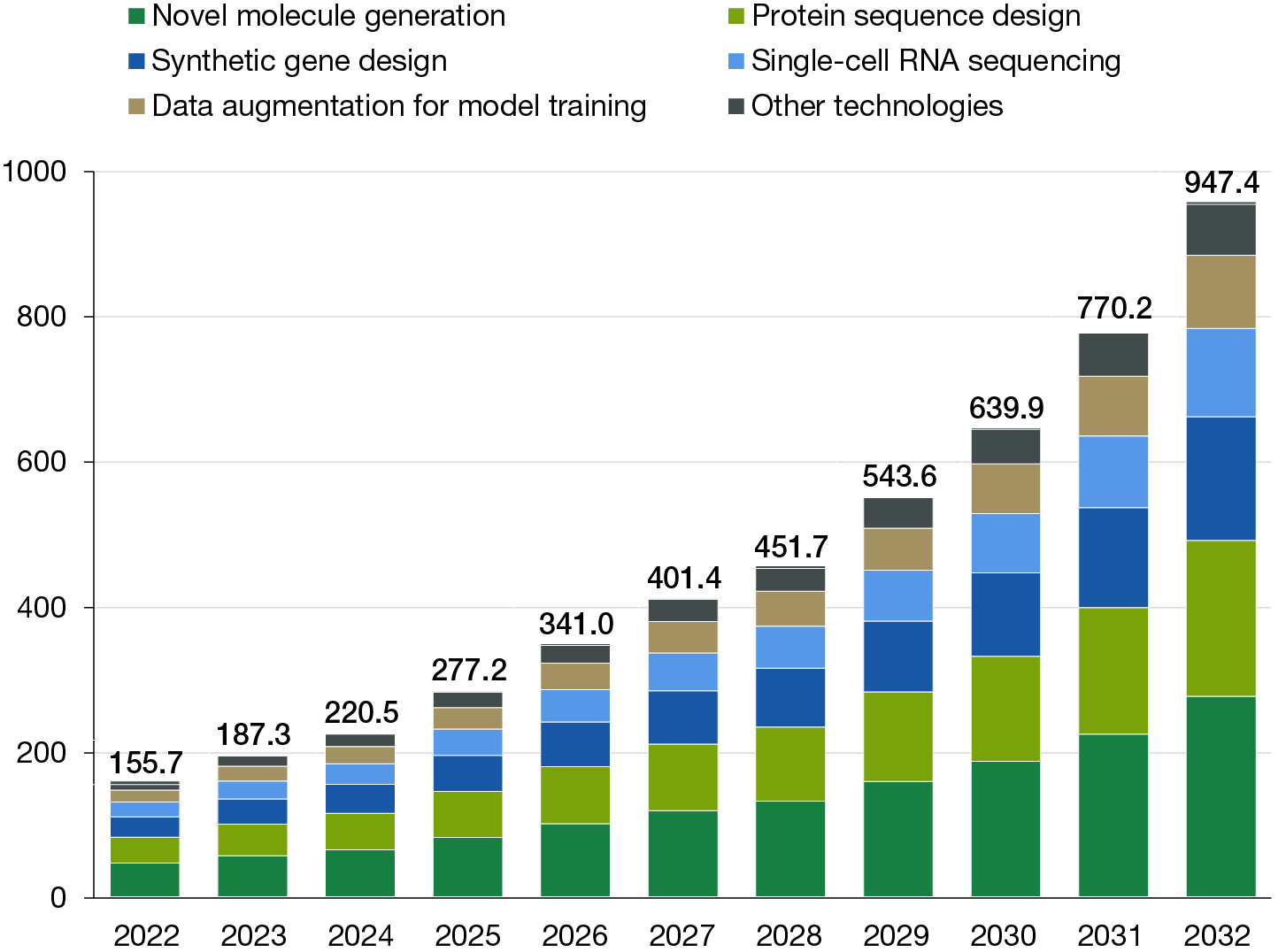 Estimates of generative AI in life sciences applications, by technology, in millions of U.S. dollars, (2022-2032E)