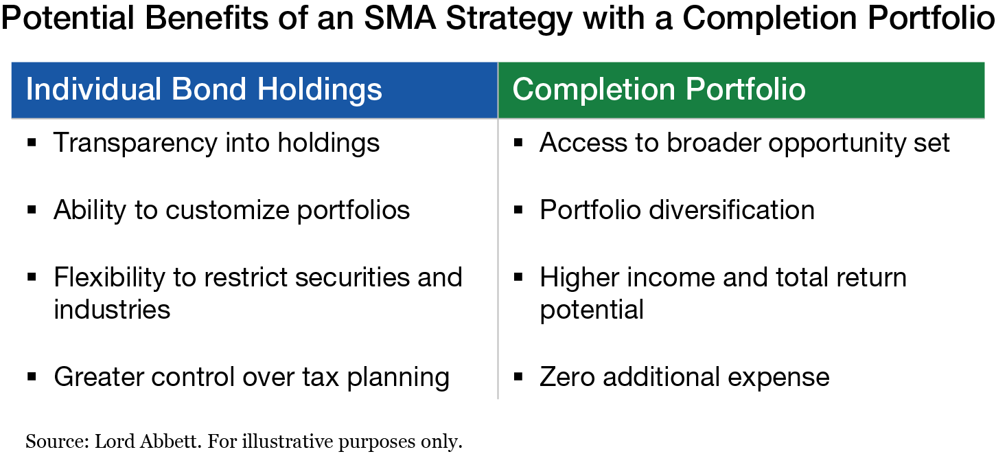 SMA portfolios that include completion portfolios are managed in a holistic manner, targeting overall portfolio exposures for yield curve, credit quality, and sector positioning. For example, the Lord Abbett Enhanced Intermediate Municipal Bond SMA strategy includes a portfolio of high-quality individual municipal bonds (rated A- or higher) along with a completion portfolio consisting of a diversified selection of more credit-sensitive municipals. This approach can enable a professional manager to deliver to SMA investors an investment solution more typically found in a mutual fund.