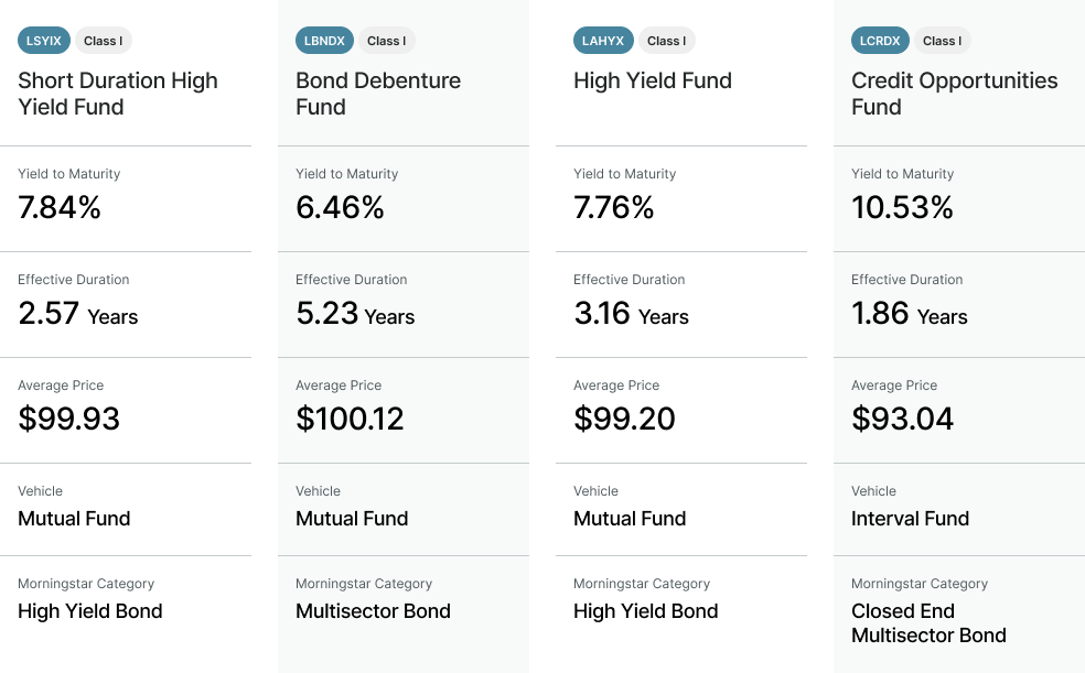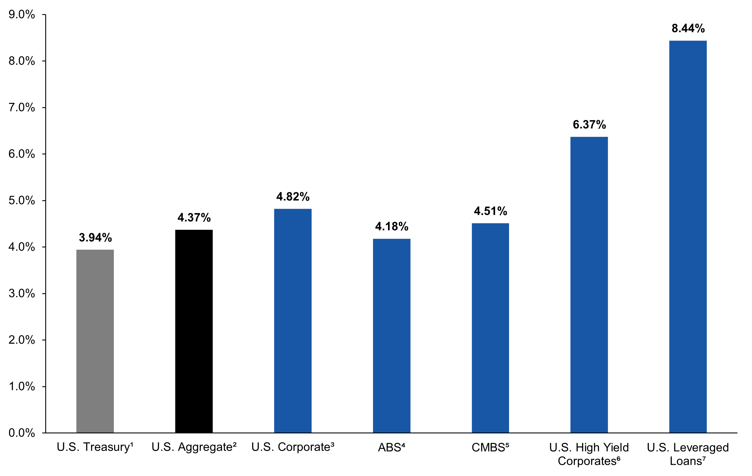 Data as of 09/30/25. ¹Bloomberg U.S. Government Index. ²Bloomberg U.S. Aggregate Index. 3Bloomberg U.S. Investment Grade Corporate Index. 4Three subsectors of the U.S. Aggregate Index: credit/charge card, auto, and utility receivables. 5 Bloomberg CMBS Index. 6 ICE BofA U.S. High Yield Index. 7Morningstar LSTA US Leveraged Loan Index. Past performance is not a reliable indicator or guarantee of future results. For illustrative purposes only and does not represent any specific portfolio managed by Lord Abbett or any particular investment. Indexes are unmanaged, do not reflect the deduction of fees or expenses, and are not available for direct investment.
